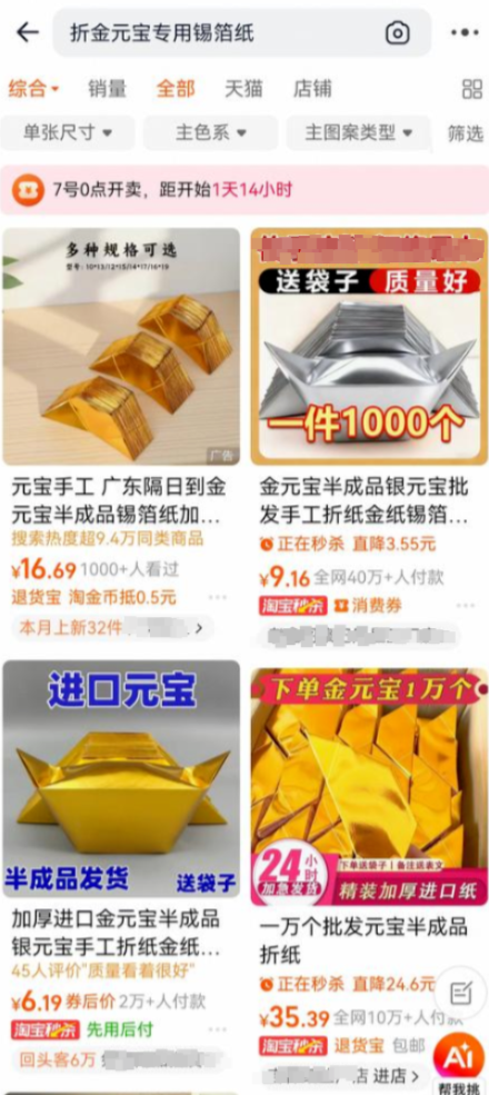 与成品元宝价格平稳形成对比的是,今年清明,手工半成品金银元宝意外成为祭祀市场爆款,尤其受到年轻消费群体的追捧。