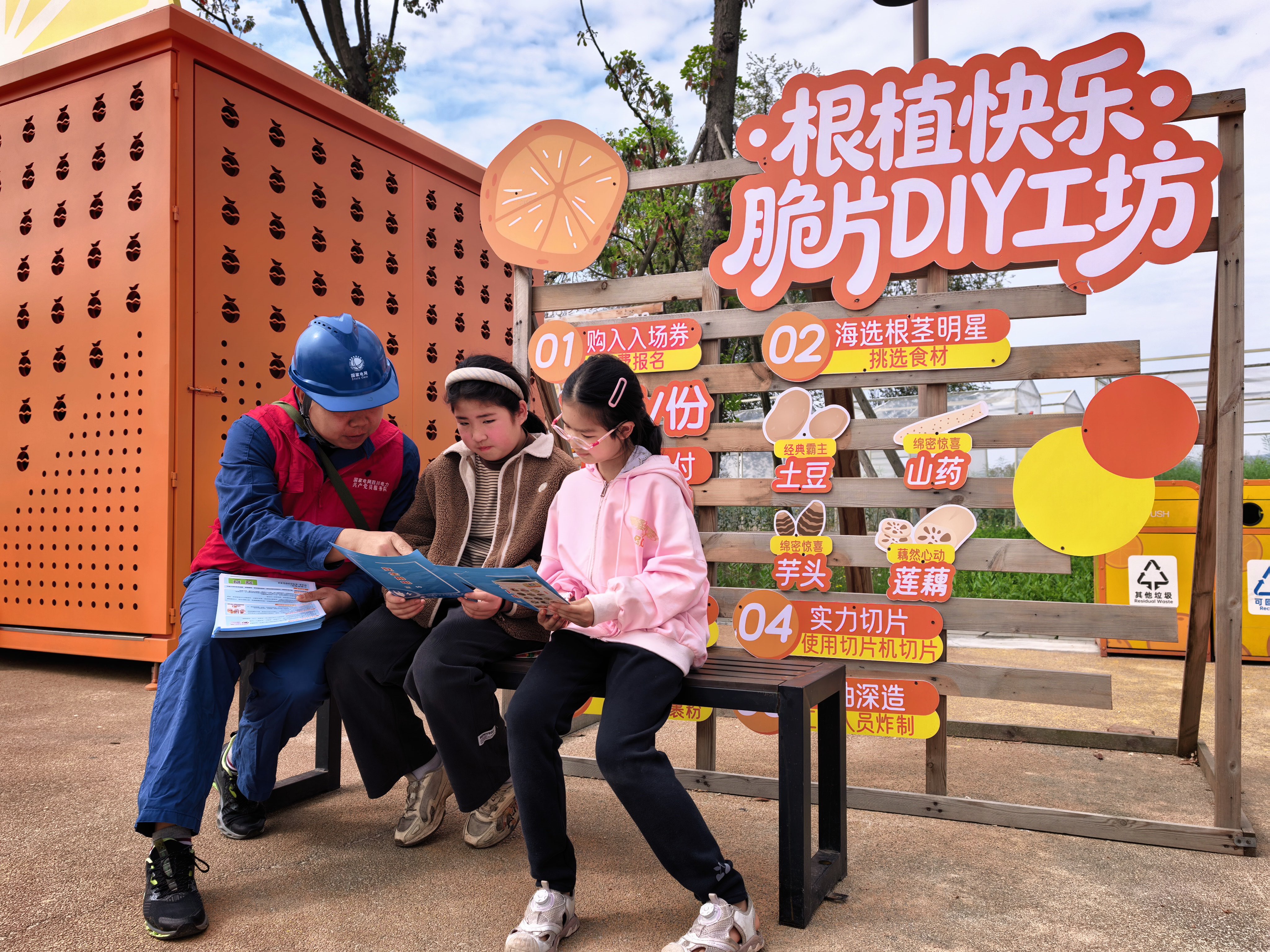 4月1日,国网四川电力(成都金堂)连心桥共产党员服务队队员张山、杨世广在天府橘乡景区向小朋友科普安全知识。(摄影 雷俊)